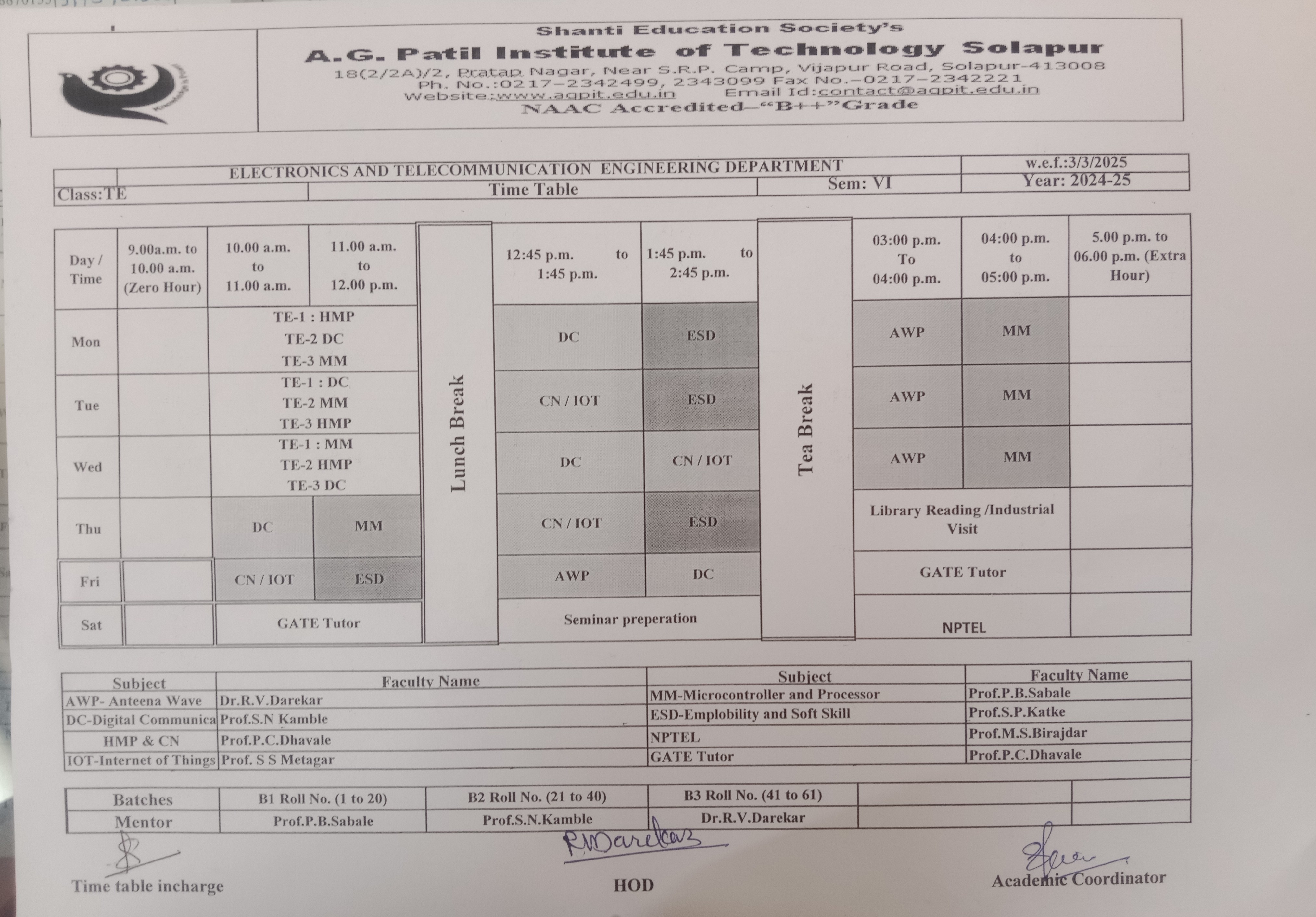 Time Table - Electronics and Telecommunication Department